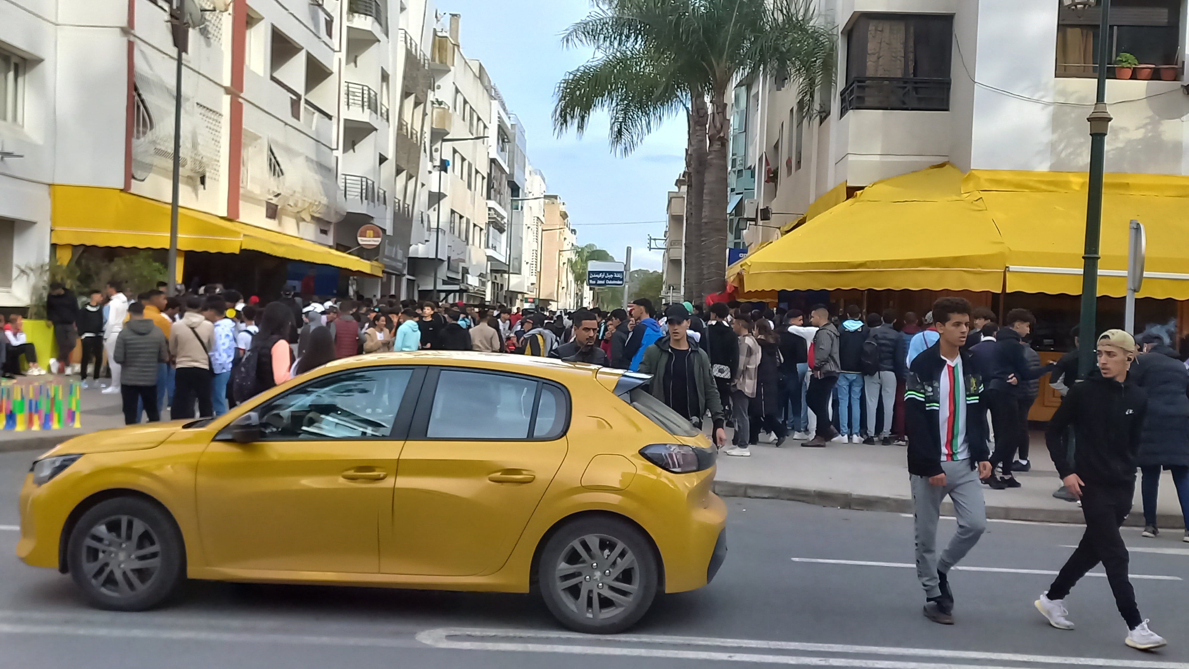 He quedado con Ghizlan para ver juntos el partido en un restaurante de Agdal en el que sirven tapas españolas y cerveza marroquí. De camino veo multitudes que rebosan las cafeterías. La ciudad se muestra radiante, solo les falta saludarme con un Aid mobarak said. Un muchacho sostiene un enorme racimo de globos rojos, vaticinando el desenlace: ¡Va a ser un día de fiesta!