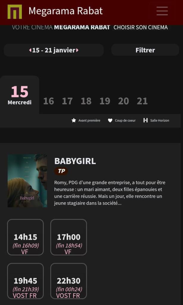 Seré rápido con Babygirl. Organizo la agenda para asistir el mismo día de su anunciado estreno, el miércoles 15 de enero, pero al comprar la entrada, ¡no la ponen! ¿Por qué no? Y yo qué sé, yo solo vendo entradas y palomitas. Mi gozo en un pozo. La siguiente vez me doy cuenta de que, justo antes de la peli, se indica el número de la visa d’explotation. El permiso para proyectarla. Seguramente Babygirl no lo consiguió por su contenido sexual.